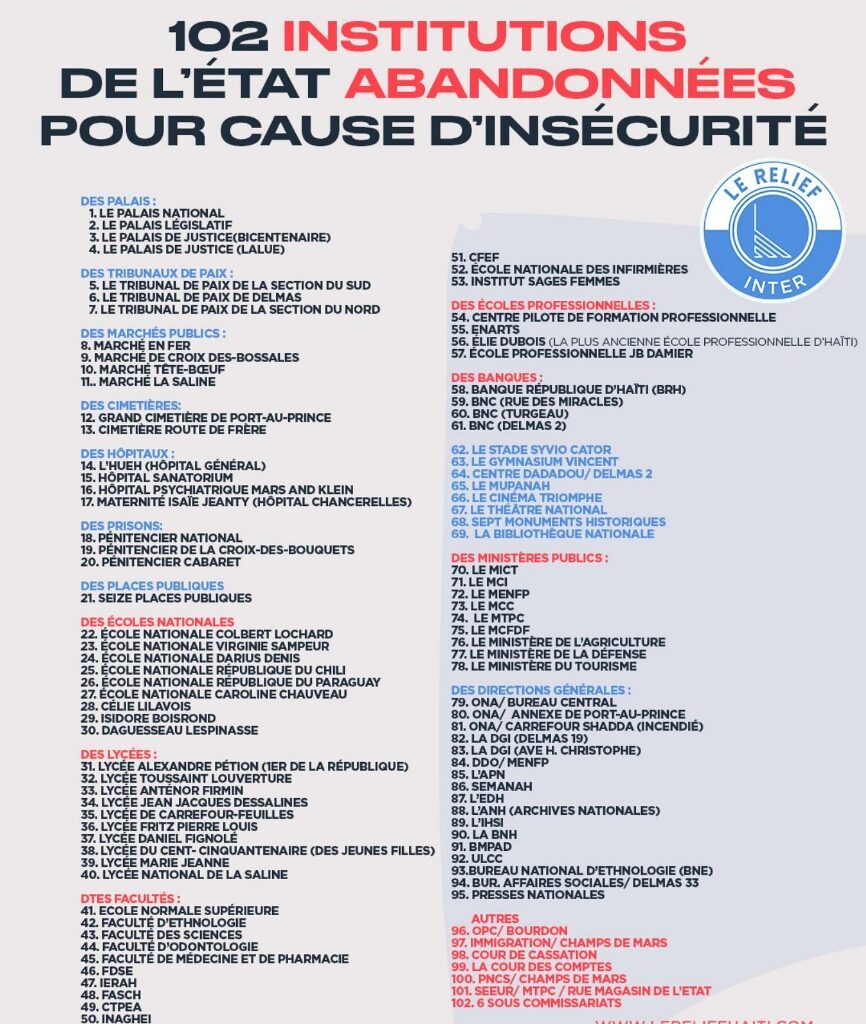 Les ministères, dont celui de l’Agriculture, de la Défense, du Tourisme, ainsi que plusieurs directions générales telles que l’ONA et la DGI, sont désormais inopérants. L’insécurité a également paralysé des institutions comme l’IHSI (Institut Haïtien de Statistiques et d’Informatique) et les Archives Nationales.