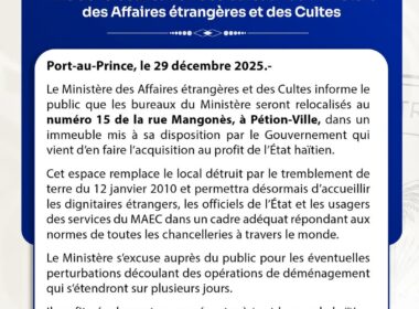 Le Consulat général d’Haïti à Santiago a adressé, le 22 décembre 2025, une correspondance officielle au ministère des Affaires étrangères afin…