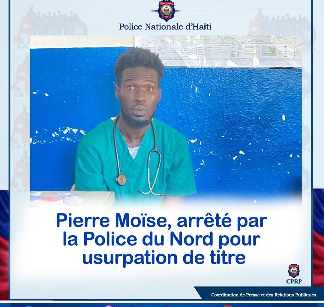 Le mercredi 15 janvier 2025, la Police Nationale d’Haiti, à travers la Direction Départementale du Nord, a procédé à l’arrestation de Pierre Moïse, un individu qui se faisait passer pour un médecin à l’Hôpital Justinien, situé au centre-ville du Cap-Haïtien.