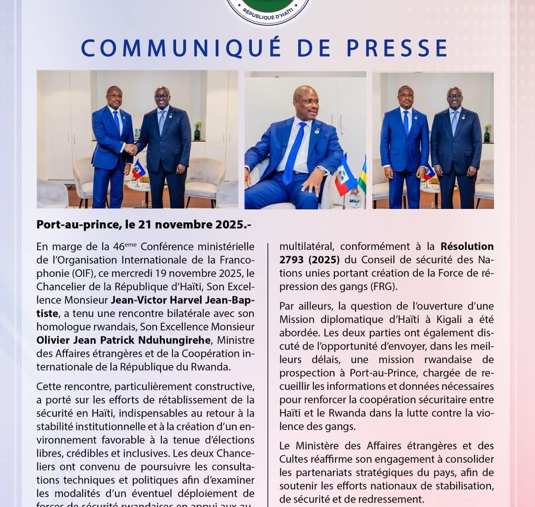 Le ministère haïtien des Affaires étrangères a publié un nouveau communiqué fortement emphatique au sujet d’une rencontre entre le chancelier Jean-Victor Harvel Jean-Baptiste et son homologue rwandais, Olivier Jean Patrick Nduhungirehe. Une lecture attentive met cependant en lumière un texte qui ressemble davantage à une tentative de mise en scène diplomatique qu’à la présentation d’avancées concrètes.