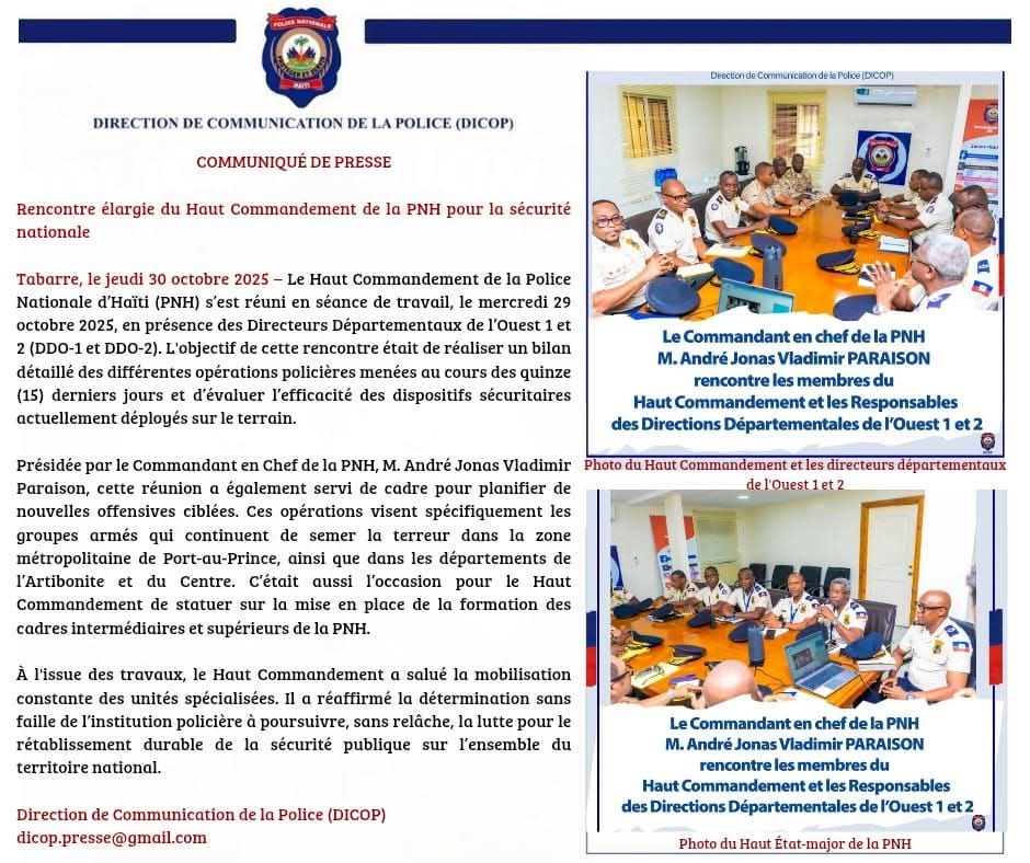 Hier, à Tabarre, le Haut Commandement de la Police Nationale d’Haïti (PNH) s’est réuni « pour la sécurité nationale ». Une expression désormais familière, mais de plus en plus vide de sens, tant elle revient à chaque communiqué sans que la réalité du terrain ne change.