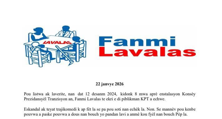 Dans un communiqué daté du 22 janvier 2026, Fanmi Lavalas estime que les tensions autour de la révocation du Premier ministre ne sont pas motivées par la volonté du CPT de sortir de son échec, mais relèvent avant tout d’une stratégie visant à maintenir le contrôle du pouvoir alors que l’échéance du 7 février approche, marquant la fin prévue du mandat de transition.