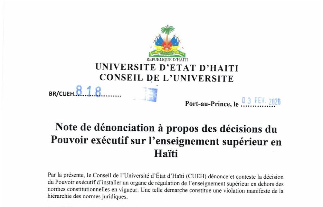 Le Conseil de l’Université d’État d’Haïti (CUEH) a publié une note officielle contestant la récente décision du Pouvoir exécutif d’installer un organe de régulation de l’enseignement supérieur. Selon l’institution, cette démarche s’effectue en dehors des normes constitutionnelles et représente une violation manifeste de la hiérarchie des lois en vigueur.