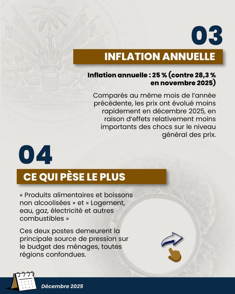 La Banque de la République d’Haïti (BRH) a indiqué que la baisse de l’inflation s’est poursuivie en décembre 2025, avec un taux annuel ramené à 25 %, contre 28,3 % le mois précédent. Ce chiffre est présenté comme une étape supplémentaire dans le ralentissement de la hausse des prix observé depuis plusieurs mois.