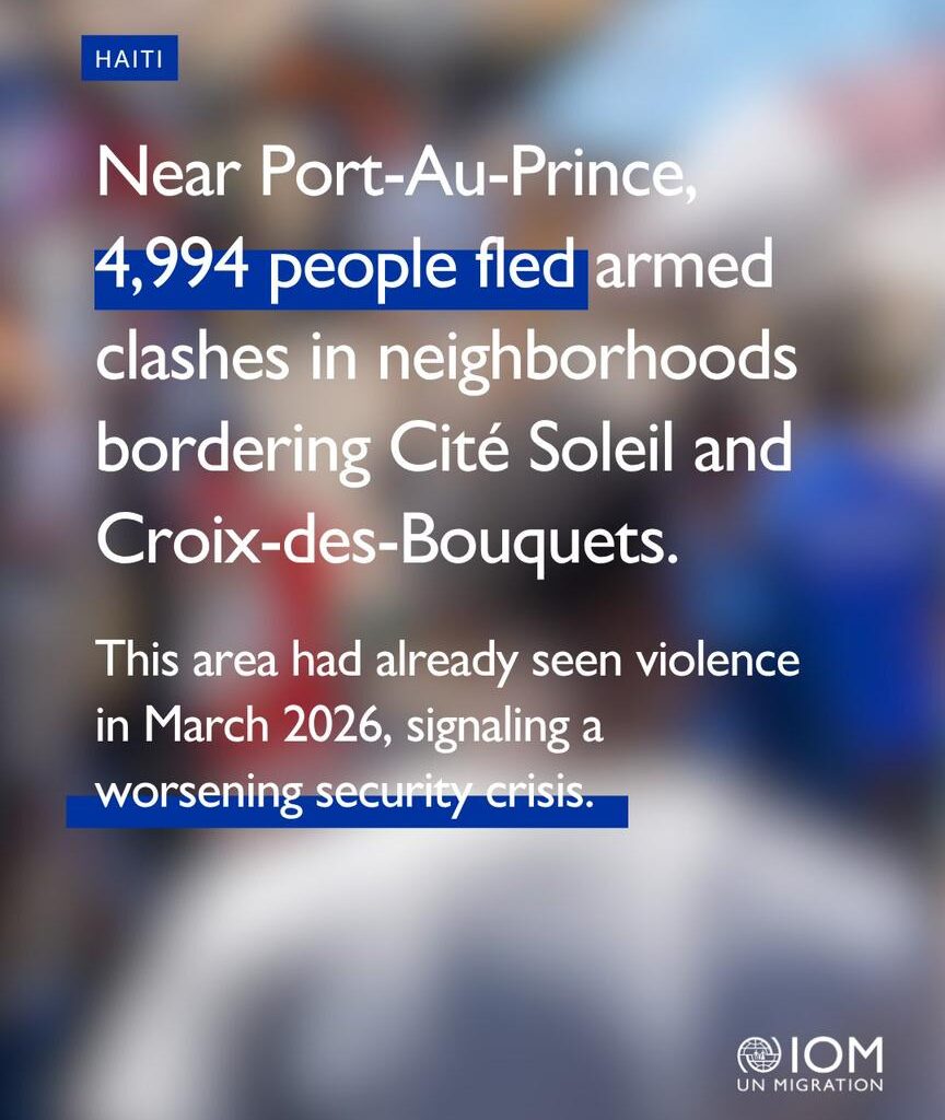 La situation humanitaire en Haïti continue de se détériorer sous l’effet de l’intensification des violences armées, qui forcent chaque jour davantage de familles à abandonner leurs foyers. Selon les dernières données de l’Organisation internationale pour les migrations (OIM) en Haïti, plus de 13 000 personnes ont été déplacées à travers trois départements du pays depuis le 13 avril.
