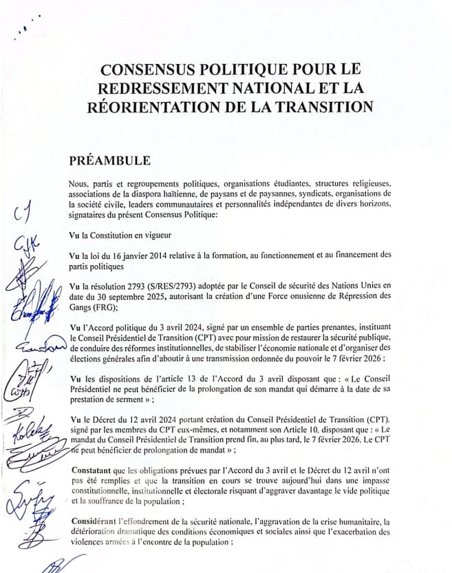 Le 12 novembre 2025, plusieurs partis politiques, organisations de la société civile, syndicats, représentants religieux et membres de la diaspora haïtienne ont signé un nouveau consensus politique à Port-au-Prince. Ce document vise à encadrer une nouvelle phase de transition nationale à partir du 7 février 2026.
