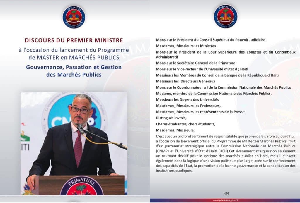 Le Premier ministre haïtien, Alix Didier Fils, a récemment lancé un programme de Master en marchés publics, un projet ambitieux visant à renforcer la gouvernance et la gestion des ressources publiques dans le pays. Selon le discours prononcé par le chef du gouvernement, cette initiative s’inscrit dans une logique de professionnalisation des acteurs publics et vise à améliorer la transparence et l’efficacité des marchés publics. Toutefois, cette annonce semble avoir pour objectif principal de détourner l’attention de la population des problèmes structurels graves qui minent le pays, notamment l’insécurité omniprésente et l’effondrement des institutions publiques.