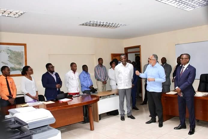 Le Premier Ministre d’Haïti, Alix Didier Fils-Aimé, a effectué ce jeudi une visite importante à l’Administration Générale des Douanes (AGD), accompagné du Ministre de l’Économie et des Finances, Monsieur Alfred Fils METELLUS. Cette visite témoigne de l’attention particulière que le Gouvernement porte à ses institutions républicaines et à leur rôle primordial dans le développement économique du pays.