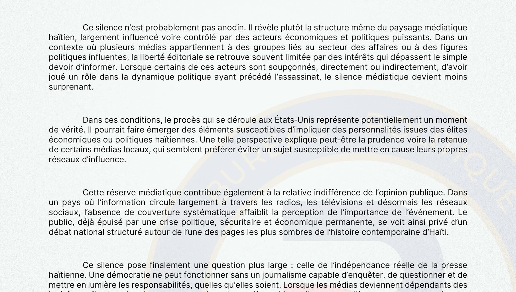 Ce silence n’est probablement pas anodin. Il révèle plutôt la structure même du paysage médiatique haïtien, largement influencé voire contrôlé par des acteurs économiques et politiques puissants. Dans un contexte où plusieurs médias appartiennent à des groupes liés au secteur des affaires ou à des figures politiques influentes, la liberté éditoriale se retrouve souvent limitée par des intérêts qui dépassent le simple devoir d’informer. Lorsque certains de ces acteurs sont soupçonnés, directement ou indirectement, d’avoir joué un rôle dans la dynamique politique ayant précédé l’assassinat, le silence médiatique devient moins surprenant.
