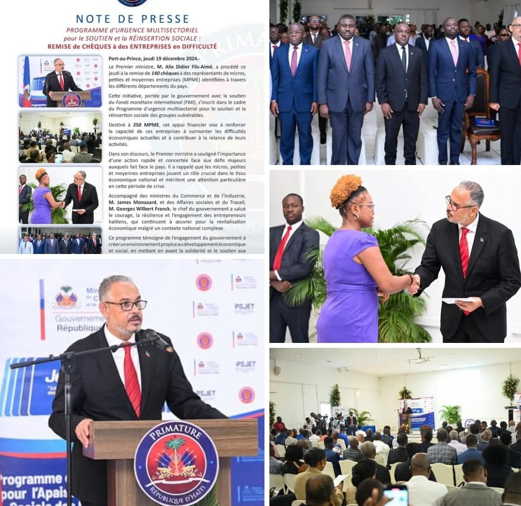 Le Premier ministre, M. Alix Didier Fils-Aimé, a procédé aujourd’hui à la remise de 140 chèques à des représentants de micros, petites et moyennes entreprises (MPME) issues des différents départements du pays. Cette initiative fait partie du Programme d’urgence multisectoriel pour le soutien et la réinsertion sociale des groupes vulnérables, lancé avec le soutien du Fonds monétaire international (FMI).