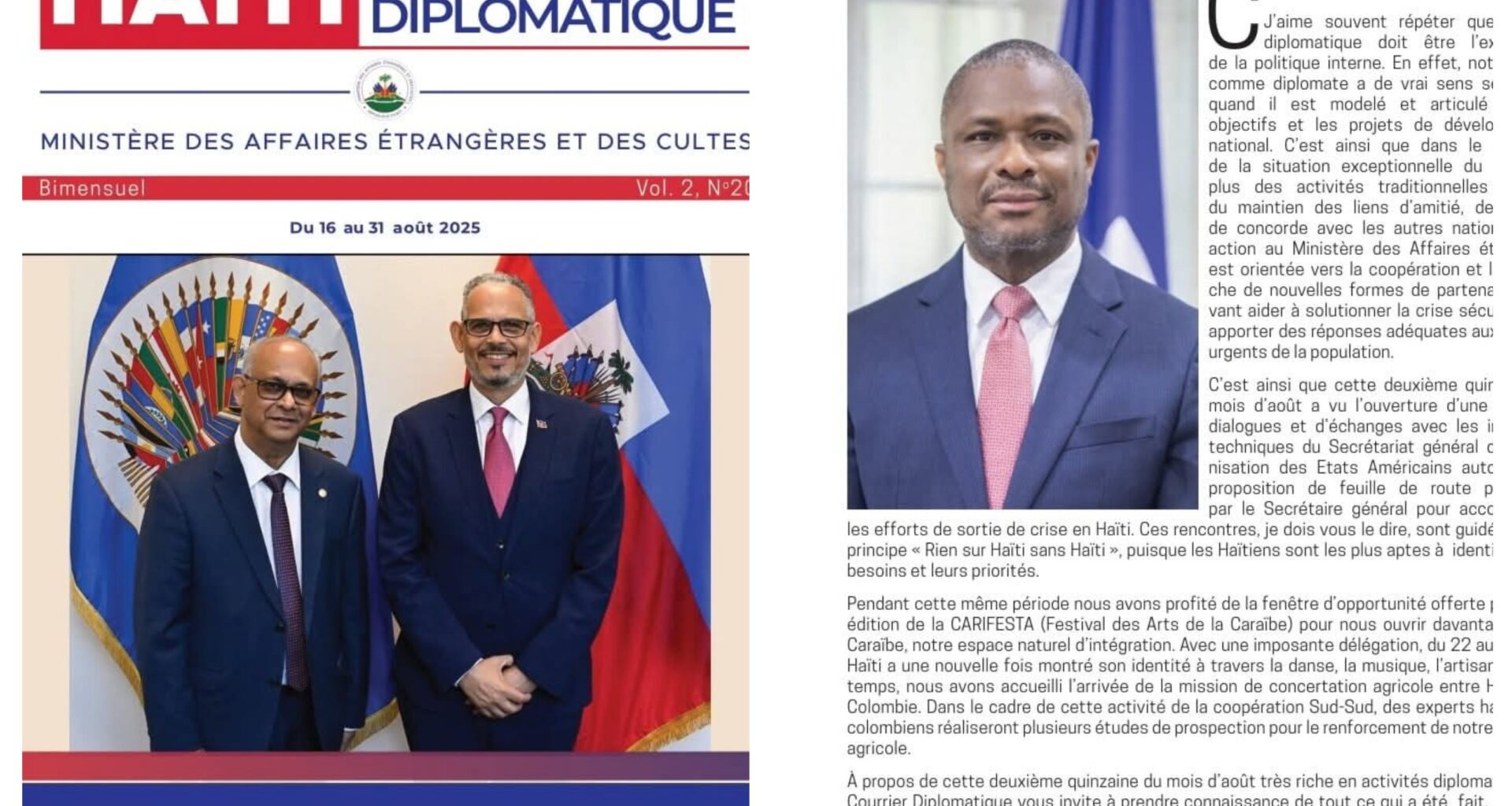 Le Courrier Diplomatique vient de publier son 20ᵉ numéro, couvrant la période du 16 au 31 août 2025. Une édition que le Ministère des Affaires étrangères présente comme le témoignage d’une « activité diplomatique soutenue ». En réalité, ce nouvel exercice d’autosatisfaction révèle surtout l’écart béant entre les communiqués officiels et la situation désastreuse d’Haïti sur la scène internationale.