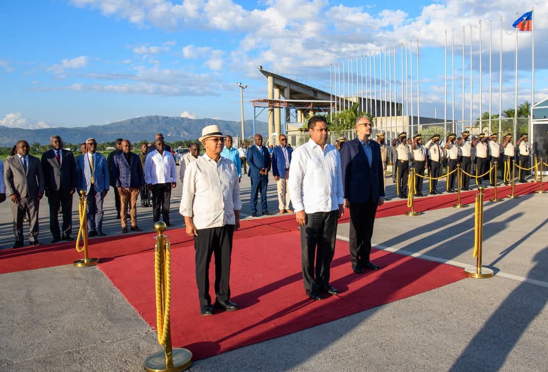 À l’aéroport international Toussaint Louverture, la mise en scène fut impeccable : tapis protocolaire, saluts coordonnés, présence du Premier ministre Alix Didier Fils Aimé, du conseiller-président Leslie Voltaire, de plusieurs membres du gouvernement, du haut commandement de la police nationale et des gradés de l’armée. Une foule d’uniformes et de titres pour accueillir un président qui revient surtout avec… des mots.