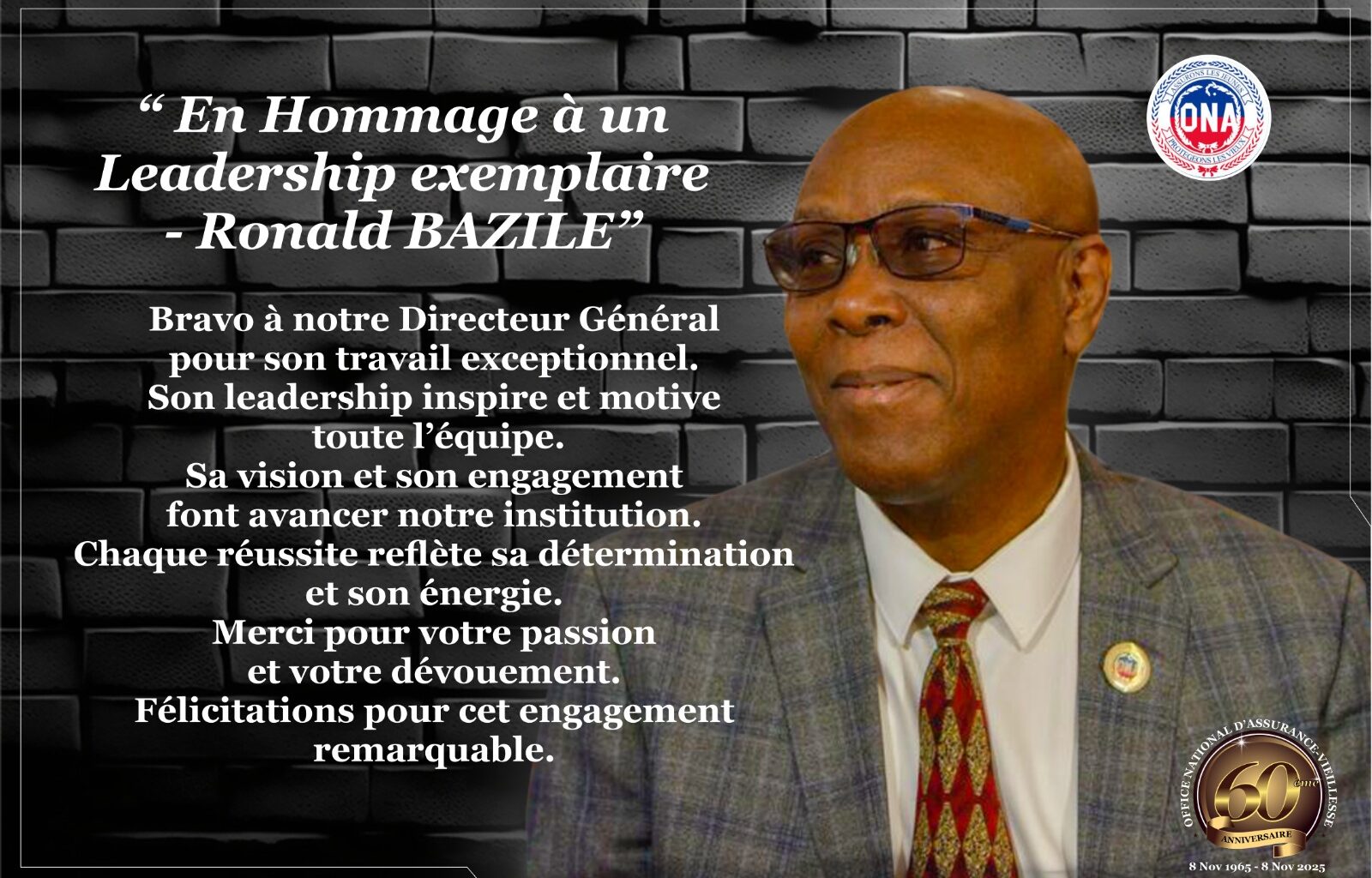 Le bureau de communication de Katèl-21 lance un appel à la reconnaissance nationale du travail accompli par le directeur général de l’Office National d’Assurance-Vieillesse (ONA), Ronald Bazile. Le bureau met en avant un leadership qu’il qualifie d’inspirant, ainsi que l’intégrité et le dévouement du dirigeant, estimant que ces qualités ont contribué à moderniser et à renforcer l’institution au profit des assurés.